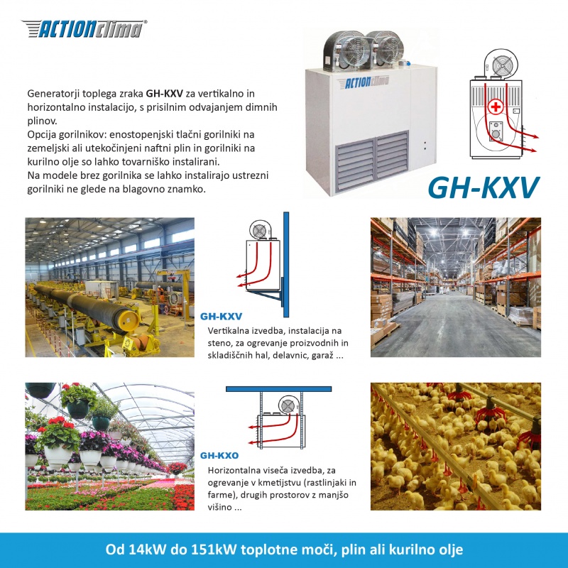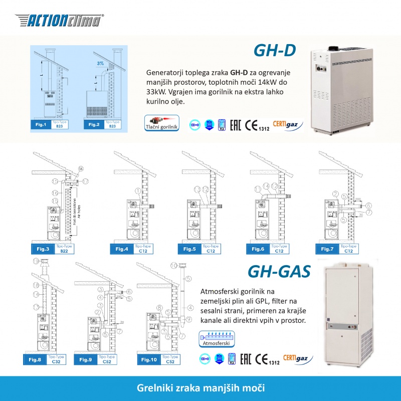 - za ogrevanje manjših stanovanjskih ali poslovnih prostorov: model GH-D na kurilno olje, 14-33kW toplotne moči, max 200Pa tlaka (krajši kanali za razvod ogretega zraka)